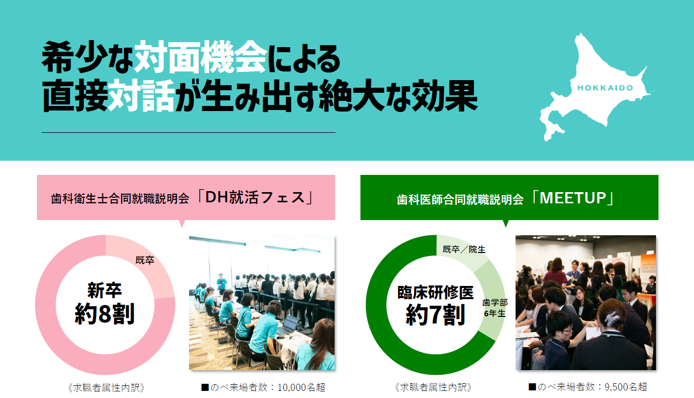 当社のキャリアイベントに来場する求職者は、歯科衛生士は約8割が新卒、歯科医師は約7割が臨床研修医であり、いずれも翌年の就職を前提に動いている「濃い」層が中心です 。