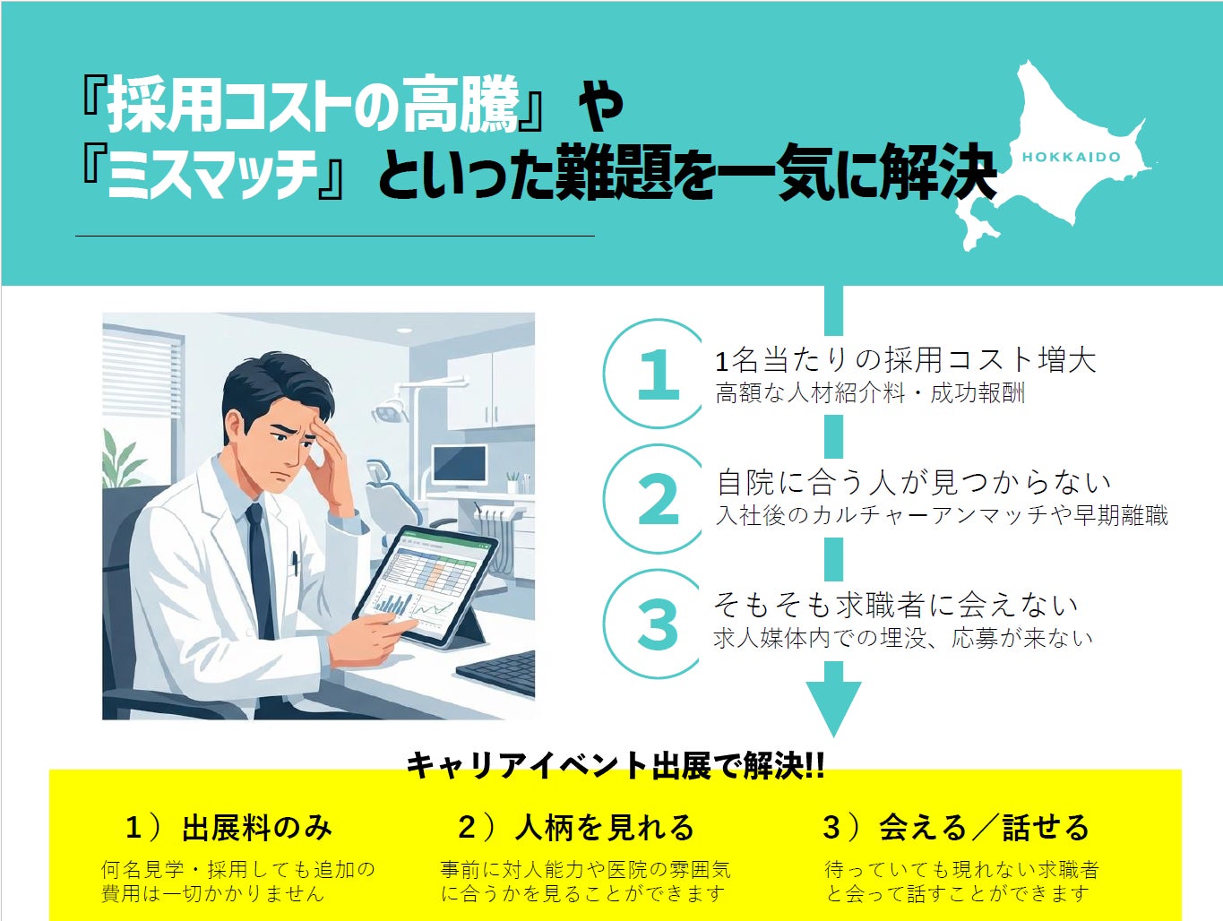 以前より全国の求人医院や学校からご要望をいただいていたこともあり、この度、当社として初めて北海道での開催を決定いたしました 。