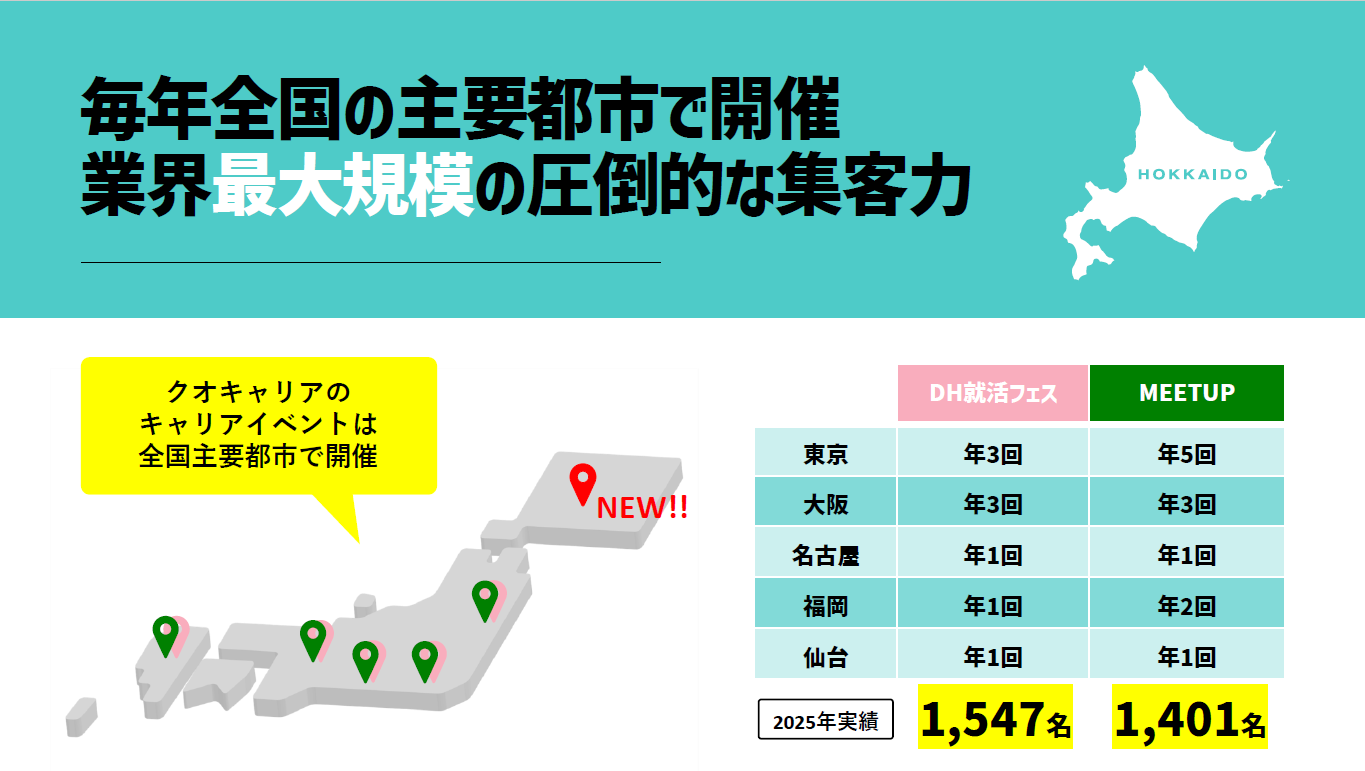 これまで東京・大阪・名古屋・福岡・仙台といった全国主要都市で開催しており、昨年は「DH就活フェス」に延べ1,500名超、「MEETUP」に延べ1,400名超の求職者が参加した、業界最大級の就活イベントです 。