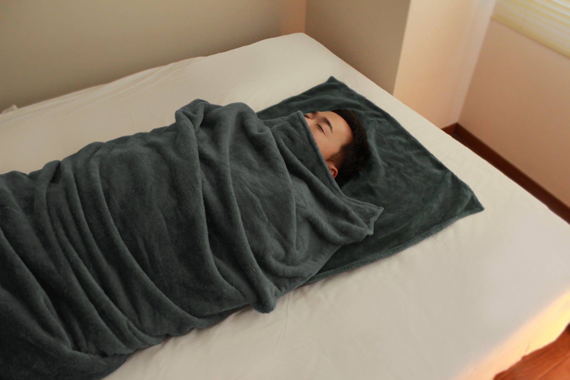 寝袋のような袋状になっているので全身をすっぽりと包み込んでくれて足の先から頭の先まであたためます。
