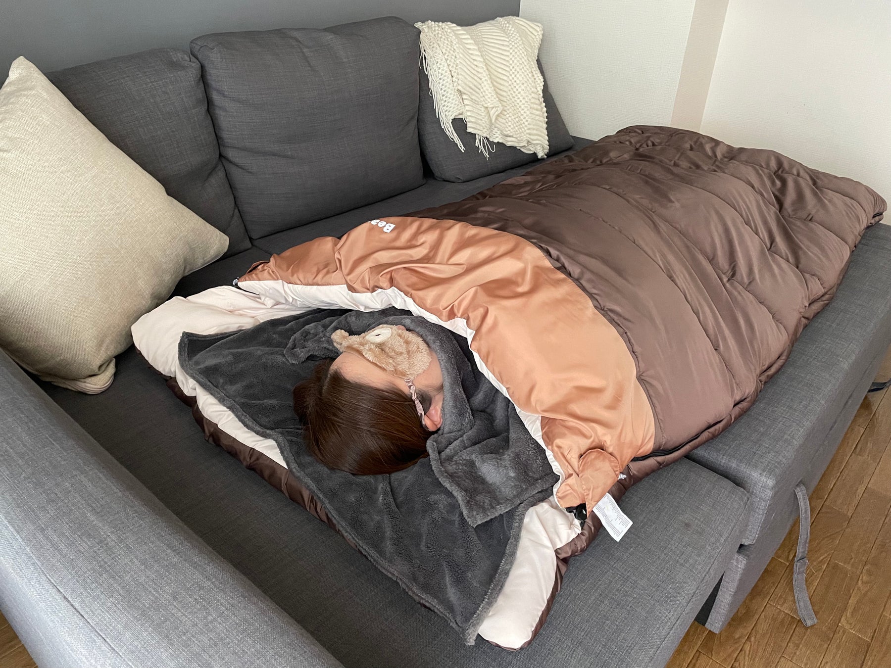 布団のようにふわふわで暖かく、寝袋と同じ中綿と生地を使っているため保温性に優れており、軽量でコンパクトに収納することができます。