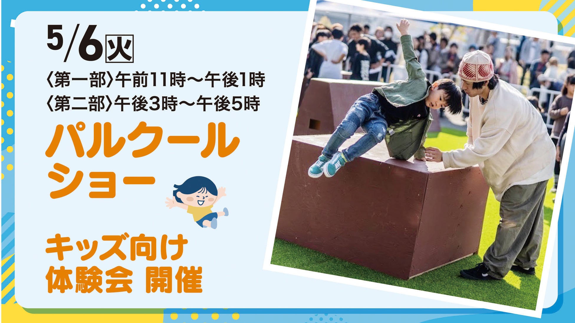 関西万博出演のパフォーマーTETRAPROJECTとB-MICEによるパルクール、トリッキングパフォーマンスとみんなで楽しめるパルクールの体験会。