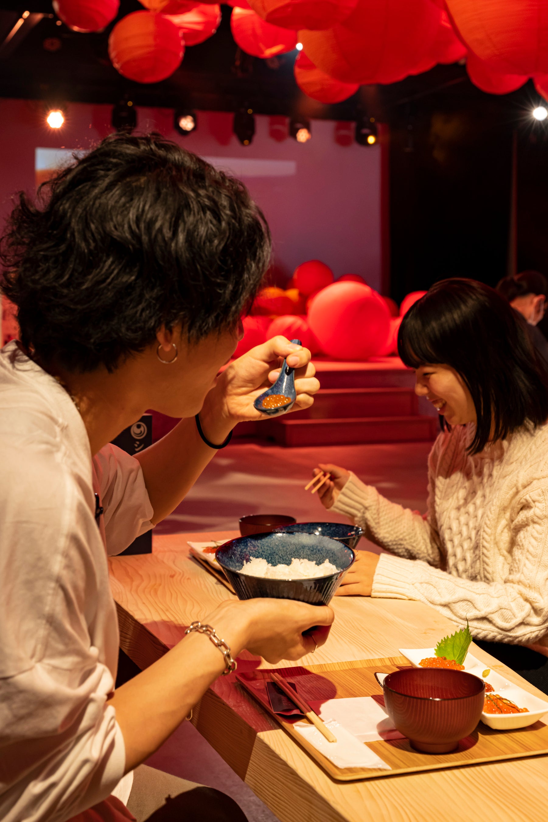 会場では、素材そのものの味が体験できる「生いくら」のほか、「醤油漬け」「オイル醤油漬け」「塩麹漬け」と4種類の味を楽しめる「シラリカいくら味比べ定食」を1,000円(税込)で提供しました。会場内はいくらをイメージした装飾で埋め尽くされ、神秘的な照明とスモークがムードを高めて訪れる人を楽しませていました。