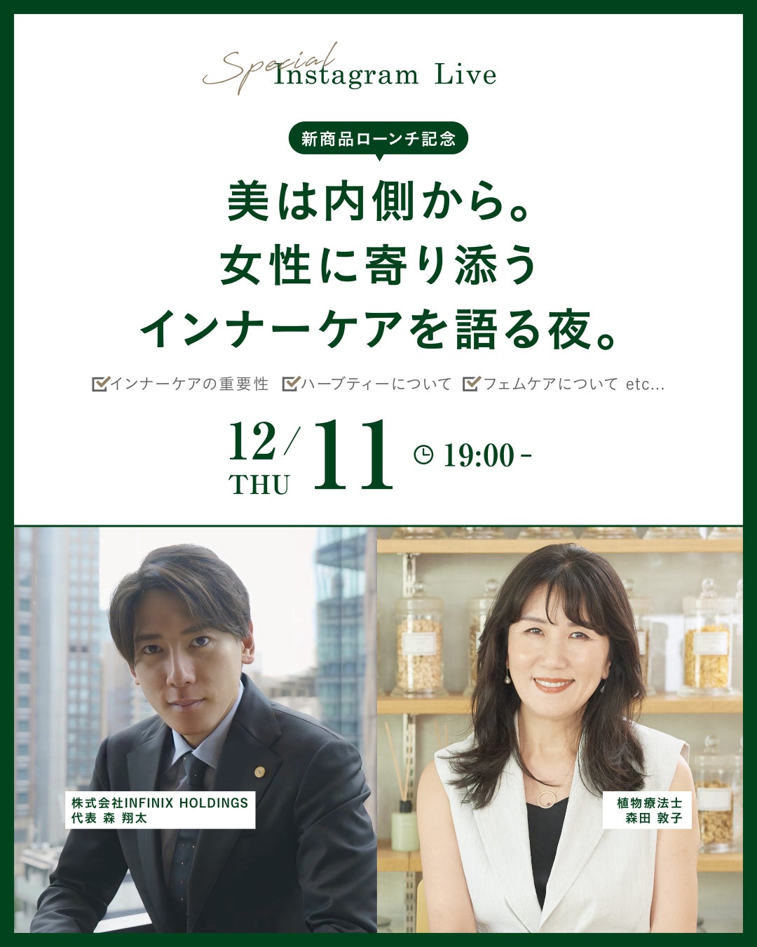 Le bois Sensの共同開発者、植物療法士・森田 敦子氏と株式会社INFINIX HOLDINGS・代表 森 翔太による「インナーケア」をテーマにしたインスタライブを配信予定です。