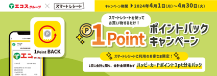 キャンペーン期間中1日1会計を上限とし、対象店舗で「スマートレシート®」を利用された方全員へ、「エコスグループ公式アプリ」のハッピーカードポイント1ポイントを還元します。