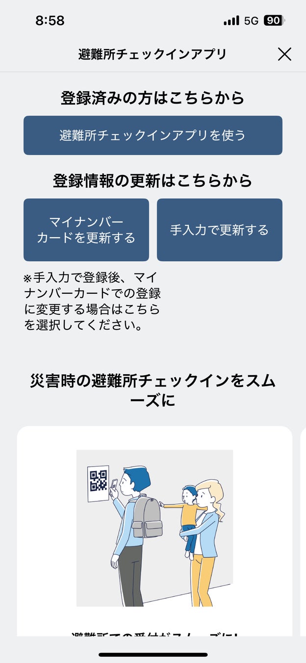 なお、避難所チェックインアプリ(ポケットサイン防災)の利用には、事前にマイナンバーカードをスマホにかざす方法または手動入力による登録が必要です(下図)。