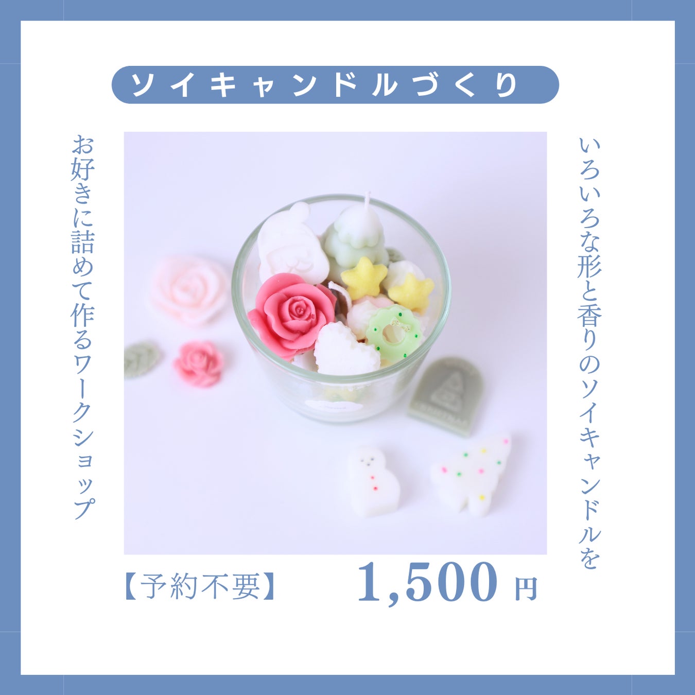 いろいろな形と香りの小さなソイキャンドルをお好きに選び、詰めていくワークショップです。お子さまにもおすすめです。