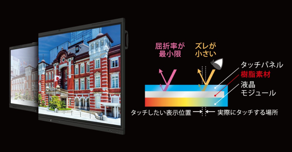 今回、ディスプレイも一新。表面処理にはダイレクトボンディング技術を新たに採用しました。パネルとガラスの隙間を埋めることで、光の反射を極限までカット。窓際の明るい席や端の席からでも、画面への映り込みが気にならず、教室のどこからでもくっきりと鮮明な映像を届けます。さらに、内部の結露を防ぎ耐久性も向上。「視認性」と「堅牢」の両立で、日々の授業を力強く支えます。