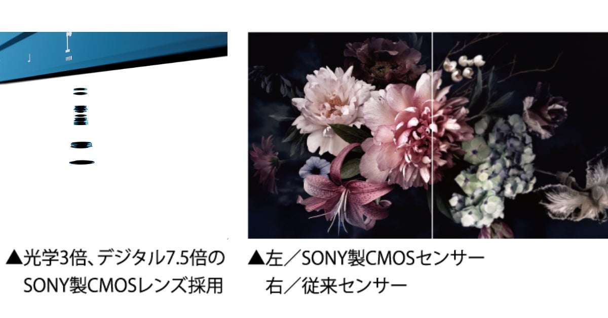 SONY製CMOSイメージセンサーを採用し、ノイズを抑えた明るく鮮やかな映像を実現。デジタルズームでは潰れてしまいがちなディテールも、光学3倍ズームなら細部までシャープに描き出し、実物から紙資料の細かな注釈まで高精細に映します。