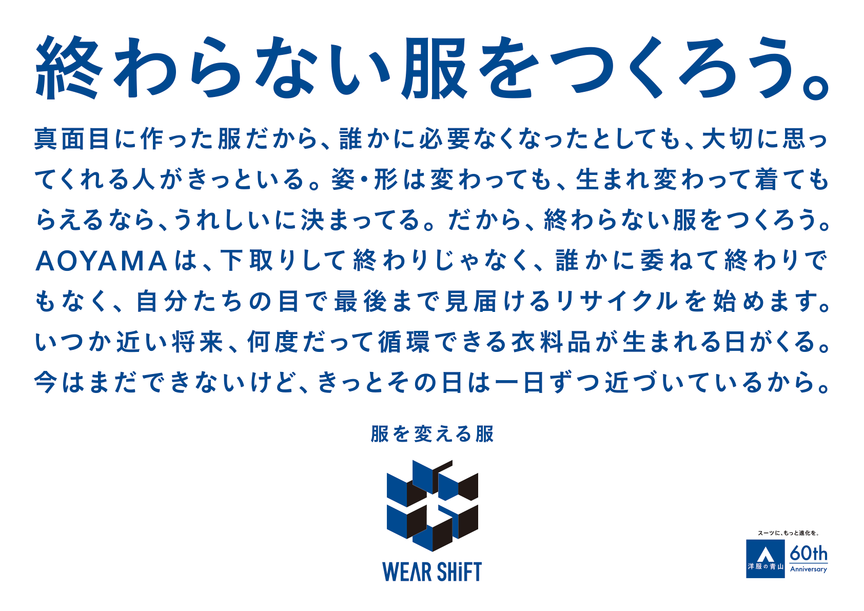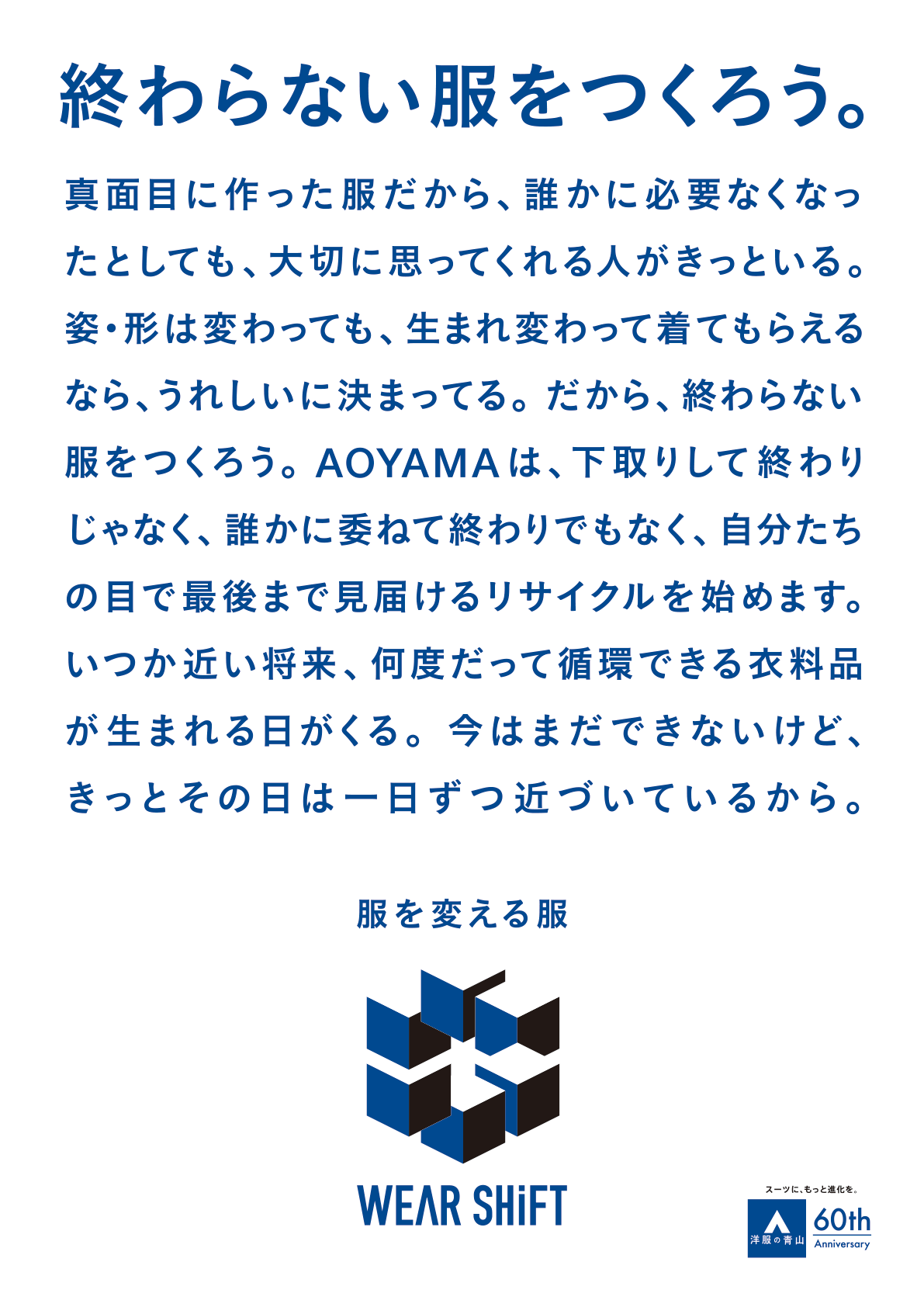 「洋服の青山」全店に不要衣類の回収リサイクリングBOX「ウエアシフト」設置 終わらない服をつくろう。お客様と一緒に手掛けるエコ活動