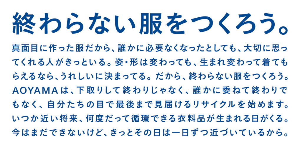 青山商事の次の時代に向けたさまざまな取り組みや、サステナブルな活動を発信するメディアです。