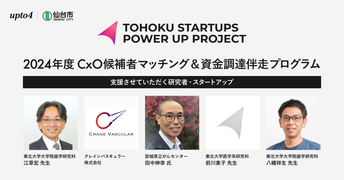 仙台・東北から社会的・経済的インパクトの創出を目指すスタートアップを支援する仙台市は、研究開発型スタートアップの経営層コミュニティを運営するupto4株式会社と共に、仙台・東北のスタートアップや起業希望者と、首都圏等に在住するスタートアップ の CxO 候補となる人材や支援者(VC、投資家、プロボノ人材、兼業志望者等)との人的ネットワーク創出や、仙台市の起業支援に関わる新たな人的ネットワーク獲得や意欲あるスタートアップ人材・支援者の呼び込みを目的とした「首都圏等スタートアップ支援ネットワーク構築業務」に取り組んでおります。