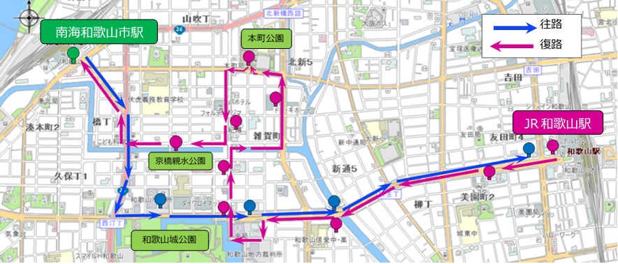 運行ルートは、令和6年度自動運転実証運行アンケート調査で要望の多かった「南海和歌山市駅」や「ぶらくり丁」周辺等を走行し、既存のバス路線ではない「城北エリア」を巡ります。