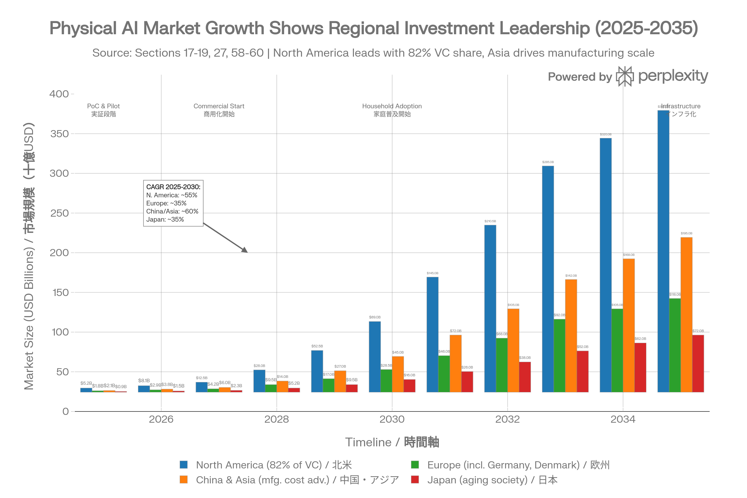 特に注目すべきは、北米資本が投資全体の82%を占める一方で、中国が低価格化とスケール戦略で追い上げ、日本が高齢化対応サービスロボットとハードウェア統合で独自の道を走り始めたという地政学的な多極化である。本レポートは、その動態を時系列・地域別・プレイヤー別に解き明かしている。