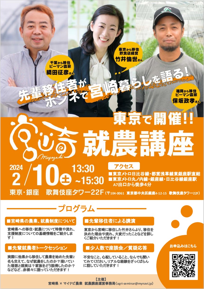【マイナビ × 宮崎県】先輩移住者による宮崎移住の本音トーク!2月10日(土)就農講座、東京で開催!!