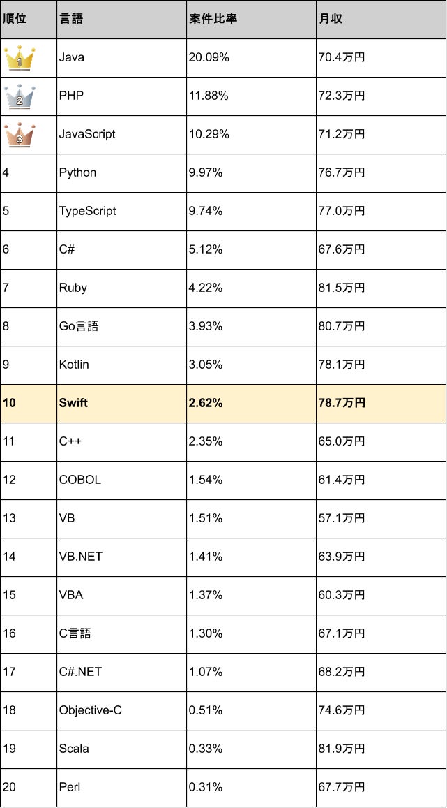 Swift案件の平均月額単価は78.7万円、平均年収は945万円で、プログラミング言語別の年収ランキングでは5位に位置しています。