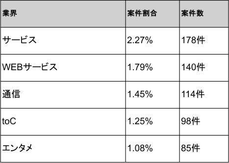 2025年10月時点のSwift案件は、サービスが2.27%(178件)で1位、Webサービスが1.79%(140件)で2位、通信が1.45%(114件)で3位、toCが1.25%(98件)で4位、エンタメが1.08%(85件)で5位となり、上位5業界で全体の約7.8%を占めています。
