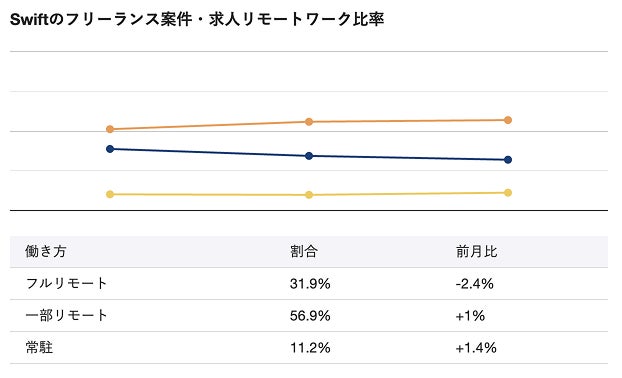 2025年10月時点のSwiftフリーランス案件・求人におけるリモートワーク比率は、フルリモートが31.9%、一部リモートが56.9%、常駐が11.2%です。前月比ではフルリモートが−2.4%で減少し、一部リモートは+1%で増加、常駐は+1.4%と小幅に上昇しています。