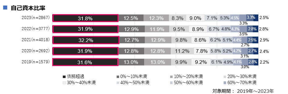 2019年から2023年の5年間を通じて、自己資本比率が40%未満の企業で約7割を占めています。また、特に債務超過(資産より負債が多く、自己資本がマイナスとなっている状態)の企業は全体の約3割で推移。この傾向は期間中ほとんど変化がなく、多くの中小企業が脆弱な財務基盤のまま事業を続けている実態が見て取れます。
