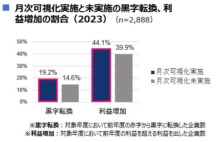 1カ月ごとの会計処理、月次決算を実施している企業 は未実施の企業と比べ黒字転換、利益増加の割合が高いという結果に。
