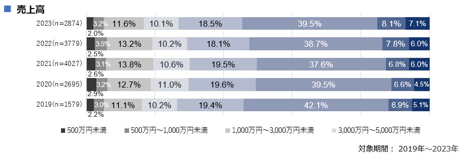 分布のボリュームゾーンは売上高が1億~5億円であり、次いで5,000万円~1億円でした。一方、500万円未満は2~3%となり、10億円以上は4~7%前後という結果に。コロナ禍の売上高の変化については、全体としては顕著な差は見られないものの、売上が3,000万円未満の割合を見ると、2019年が16.3%であったのに対し、2020年は18.8%、2021年は19.5%と増加傾向を示しました。2022年には19.2%となり減少に反転し、2023年は16.8%と2019年レベルにまで戻しています。これはコロナ禍での経営の厳しさと、売上が3,000万円以上の割合が相対的に増えていることから、コロナ後の経営改善の実態が表れていると考えられます。