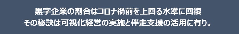 本レポートでは、第1章で中小企業の財務データの分析を、第2章で経営改善を実現した企業の取り組みについて検証しました。全体を通して厳しい経営環境に直面しつつも、月次決算による可視化経営の実践が黒字転換や利益増加に効果があることが明らかになりました。さらに、外部の専門家や専門機関による伴走支援を活用すれば、効率的な経営改善が可能であること、その伴走支援も黒字転換、利益増加に資することがデータ分析から読み取れます。