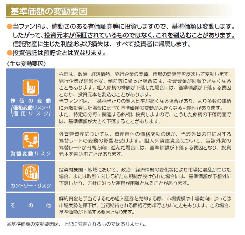 投資信託は値動きのある有価証券等に投資しますので、基準価額は大きく変動します。したがって、投資元本が保証されているものではありません。信託財産に生じた利益および損失はすべて投資者に帰属します。投資信託は預貯金とは異なります。