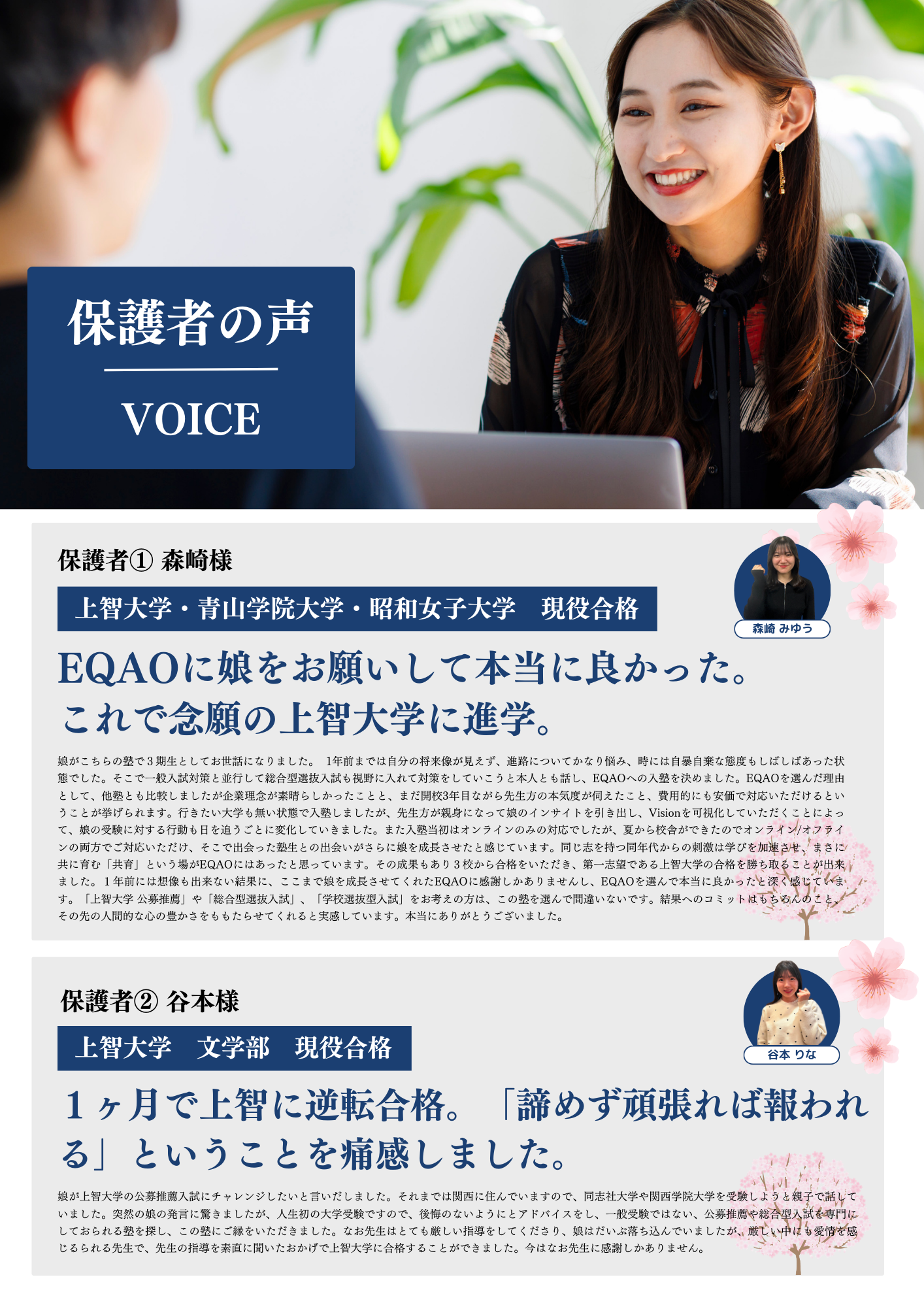 中•高校時代、バスケットボール部に所属。高校1年の時には、カナダに1年留学し、帰国後は、数々の実地調査を経て、移民の受け入れ体制について英語で論文を執筆。英語資格は、IELTS6.5、英検準1級を取得。成績は評定平均4.6を維持。その他にも、英語プレゼン大会近畿優勝、複数の政治家への取材、ボランティア委員会委員長としての活動など、多岐に渡る活動を武器にAO入試を利用して受験に挑むも、見事に惨敗。5校から不合格をいただいた。AO入試において強いとされる実績を数多く持ちながらも、不合格だったことを疑問視し、AO入試について研究を開始。そこで発見した「必敗法」を踏まえて、書類を全て書き直し出願したところ、上智大学をはじめとする難関私大3校に合格。この経験から、18歳の時にEQAOの前身であるAO入試専門塾ONLINE AOを緊急事態宣言中に起業。19歳の時には、リラクゼーション事業を立ち上げ、2023年に事業譲渡。20歳の時には、浜松町にEQAO本校舎/オンライン校を設立。「すきを見つけて、すきを伸ばす」という教育理念を胸に、挑戦を恐れず、未来ある子ども達の成長に人生を捧げたい。