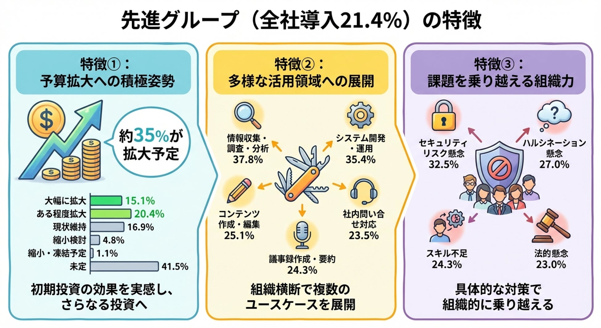 本調査の結果、全社的に生成AIを導入済みの企業は21.4%で、約5社に1社が先進グループに該当することが明らかになりました。さらに、これらの先進企業の約35%が予算拡大を計画しており、複数の業務領域で横断的にAIを活用する傾向が確認されました。