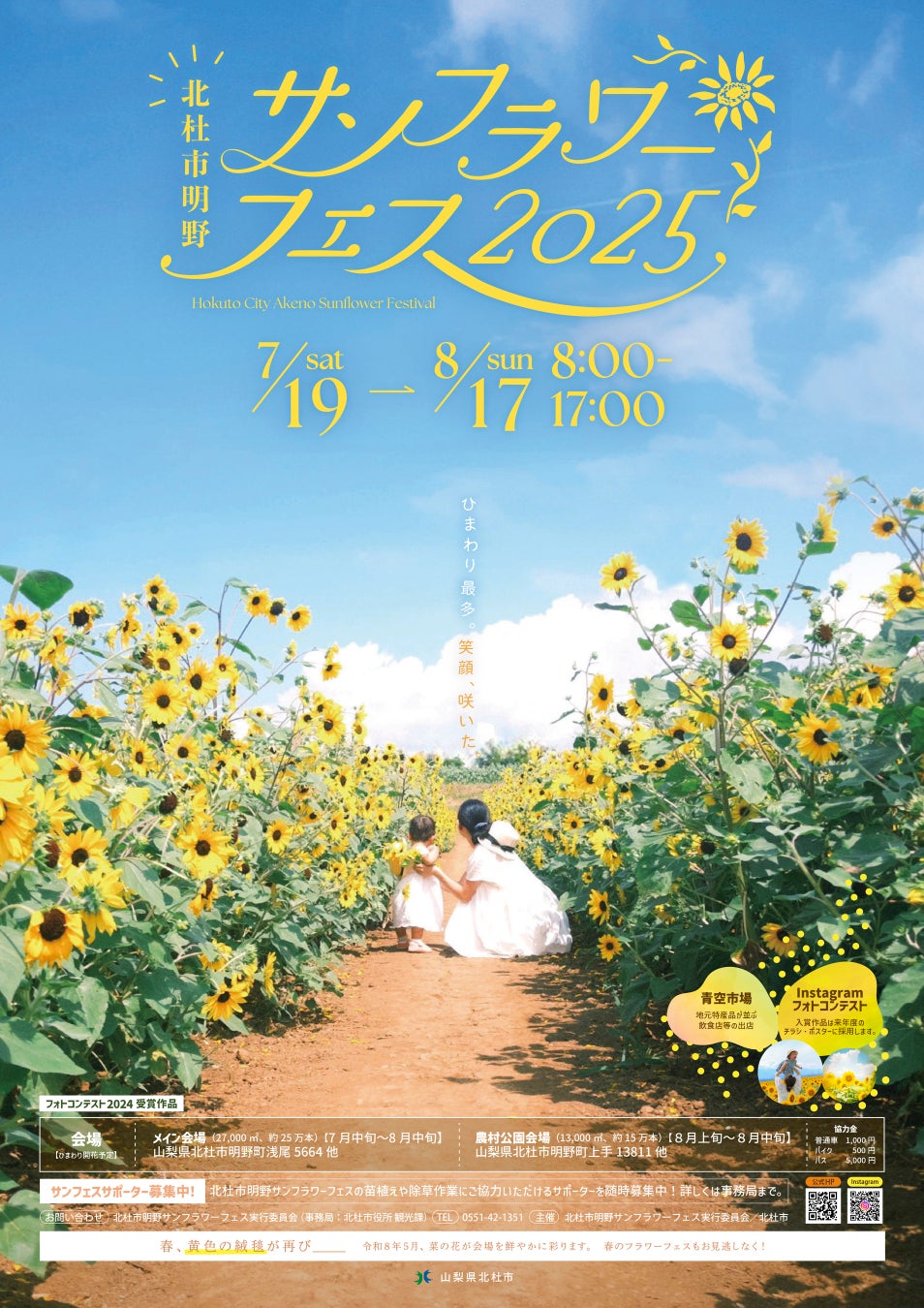 山梨県北杜市(市長:大柴邦彦)と北杜市明野サンフラワーフェス実行委員会(会長:秋山俊和)は、日本有数の日照時間の長さを誇る山梨県北杜市明野町で、令和7年7月19日(土)から8月17日(日)の期間、八ヶ岳・南アルプス・富士山を望む大パノラマの中に約40万本のひまわりを咲かせる「北杜市明野サンフラワーフェス2025」を今年も開催いたします。