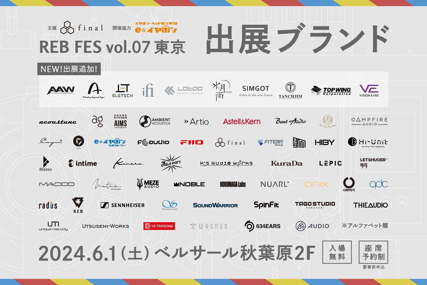 また、「Analog Squared Paper」様、「合同会社地球世界」様、「TOP WING Cybersound Group」様が新たに出展追加となりました。過去最大規模の29社60ブランドからおよそ1000機種のオーディオ機器をお楽しみいただけます!6月1日(土)はREB fes vol.07@東京へぜひお越しください!