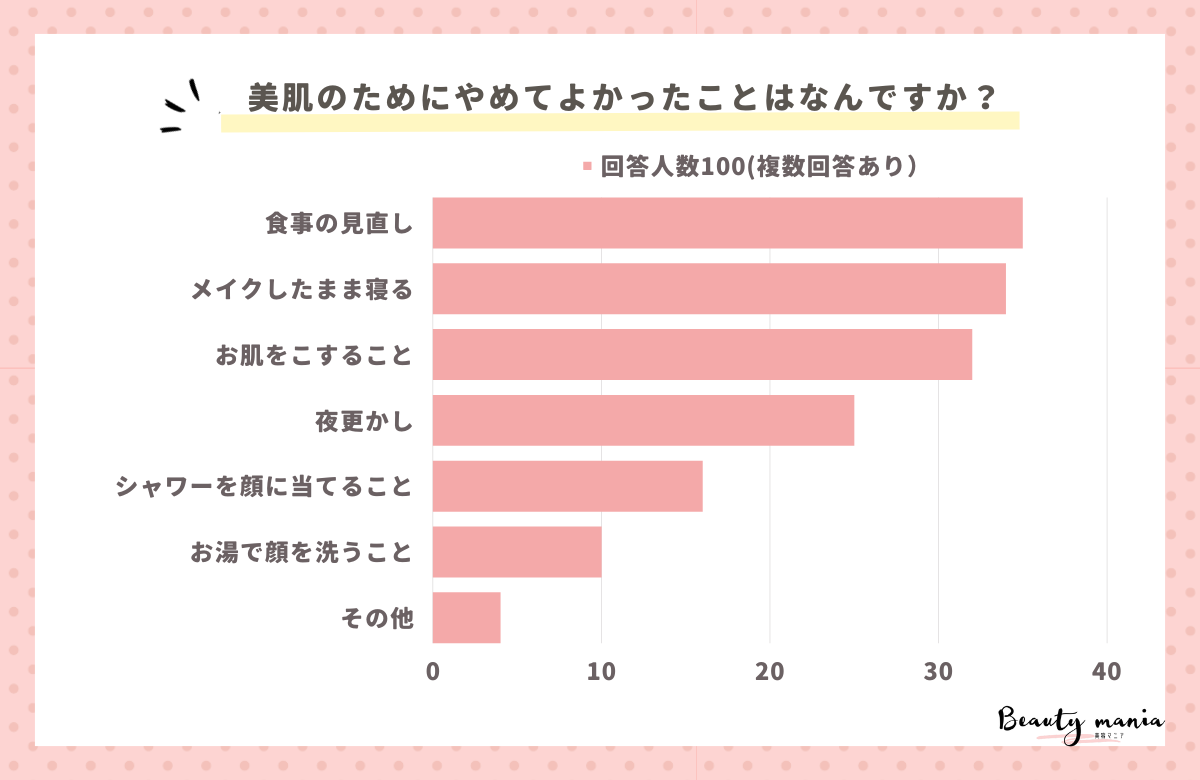 「美肌のためにやめてよかったことはなんですか?」とアンケート調査した結果、1位は『食事の見直し(ジャンクフードを控えるなど)(35人)』、2位は『メイクしたまま寝る(34人)』、3位は『お肌をこすること(32人)』となっています。