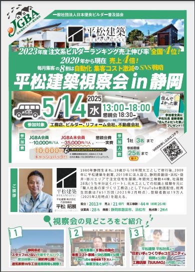 今回の視察ツアー開催企業は「圧倒的な知識量」による家づくりで、2023年度注文系ビルダーランキング売上伸び率 全国4位、2020年から現在 売上4倍を達成した平松建築株式会社で決定しており、同社の建築現場やモデルハウスといった施設を実際に視察する予定となっております。2025年5月14日(水)に開催が決定しており、会員企業に問わず全国の工務店、住宅会社が参加予定です。
