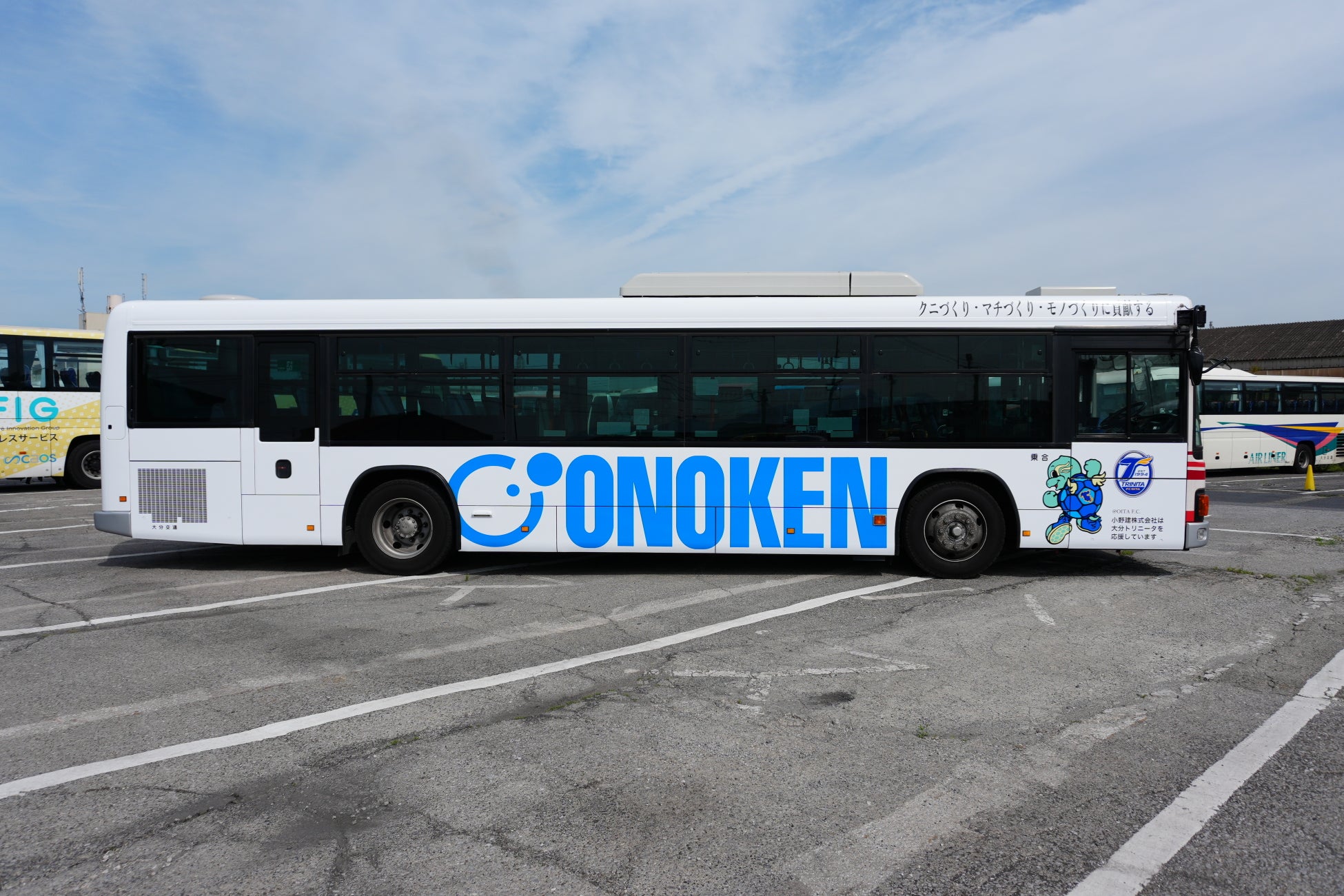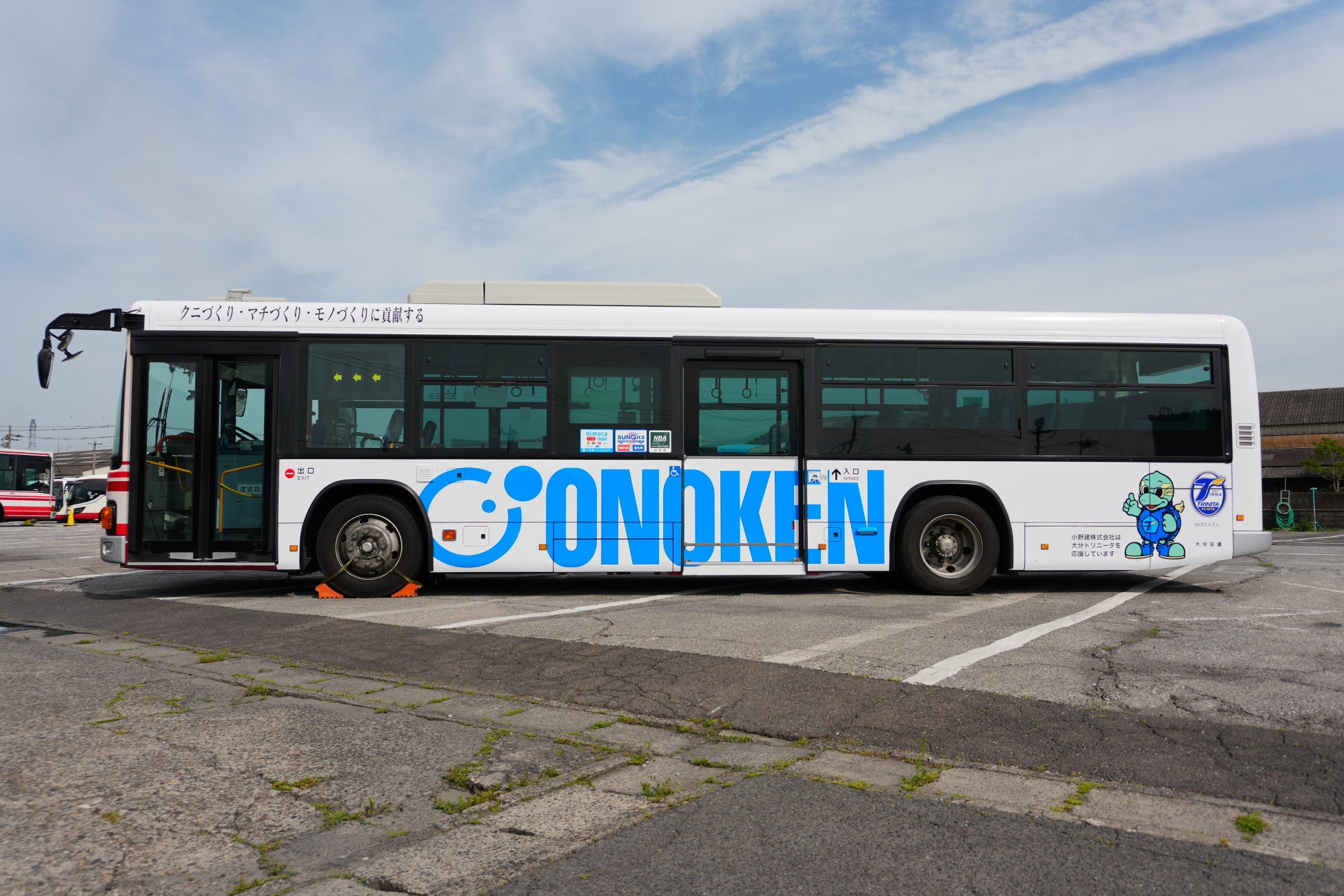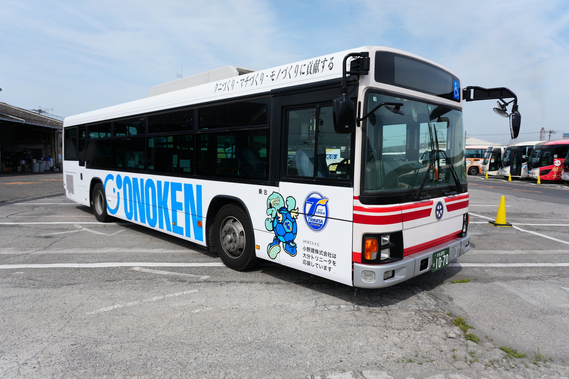 小野建は、2025年5月1日から大分県を盛り上げるラッピングバスの運行を開始しました。ラッピングバスは、大分県のスポーツチームであり当社がスポンサーとなっている「大分トリニータ」のロゴマークやマスコットキャラクターのニータンを打ち出しております。