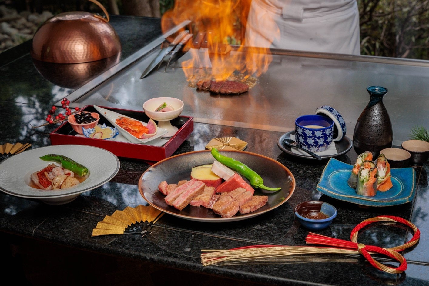 また、同レストランでは「お正月鉄板焼きディナーコース」もご用意。伊勢海老や鮑の鉄板焼きや神戸ビーフの食べ比べなど贅沢尽くしのコースです。