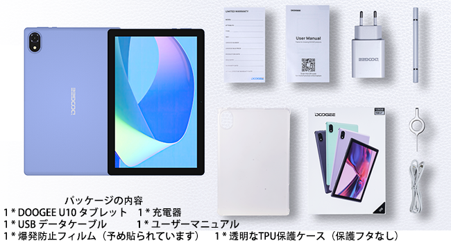 このストレージアップグレードU10タブレットには、充電器、充電ケーブル、カードピン、日本語取扱説明書、保証書、U10用保護ケースなどの付属品が同梱されています。