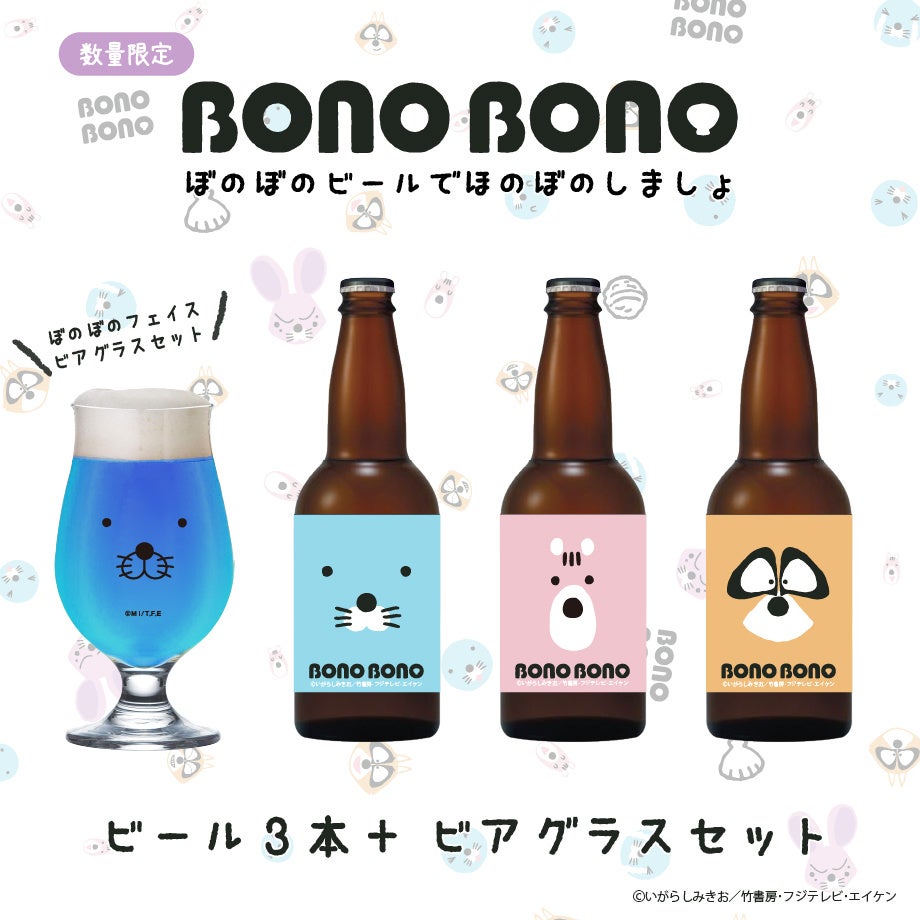 『ぼのぼの』のキャラクターをイメージした3色のクラフトビールと、