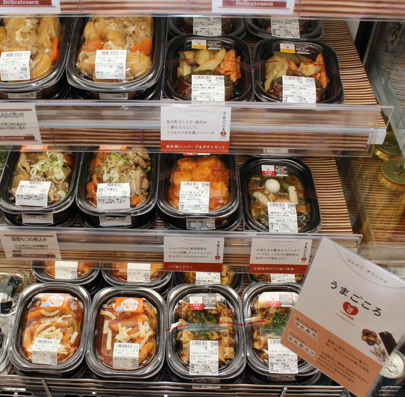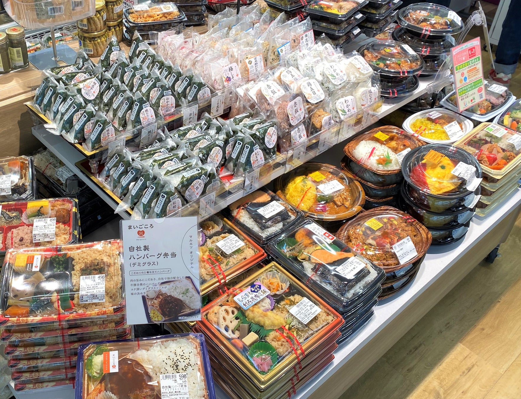 惣菜では、自社センターで素材からとった出汁を使用した『自社製出汁を使ったロースカツ丼』などを販売するほか、素材や調理法にこだわり開発・製造した 『まいごころ』(米飯商品)、『うまごころ』(お惣菜)のオリジナルブランド商品を多数展開いたします。また、栄養バランスや食塩相当量などの健康に配慮したお弁当や人気のフライ、中華などを品揃えいたします。