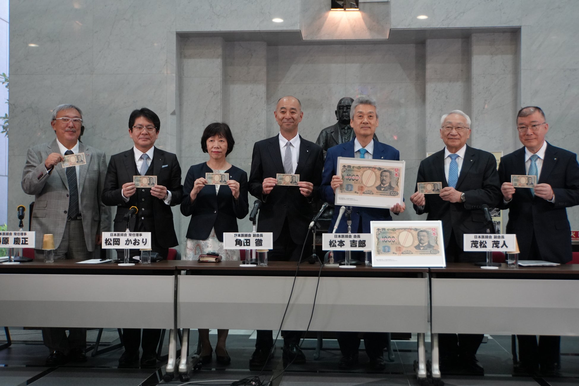 また、松本会長は千円札がお札の中で最も流通量が多く、国民に一番親しまれているお札であることにも触れ、日本医師会としても国民に親しまれ、信頼される医師会として、国民の皆さんの生命と健康を守っていくとの決意を示しました。