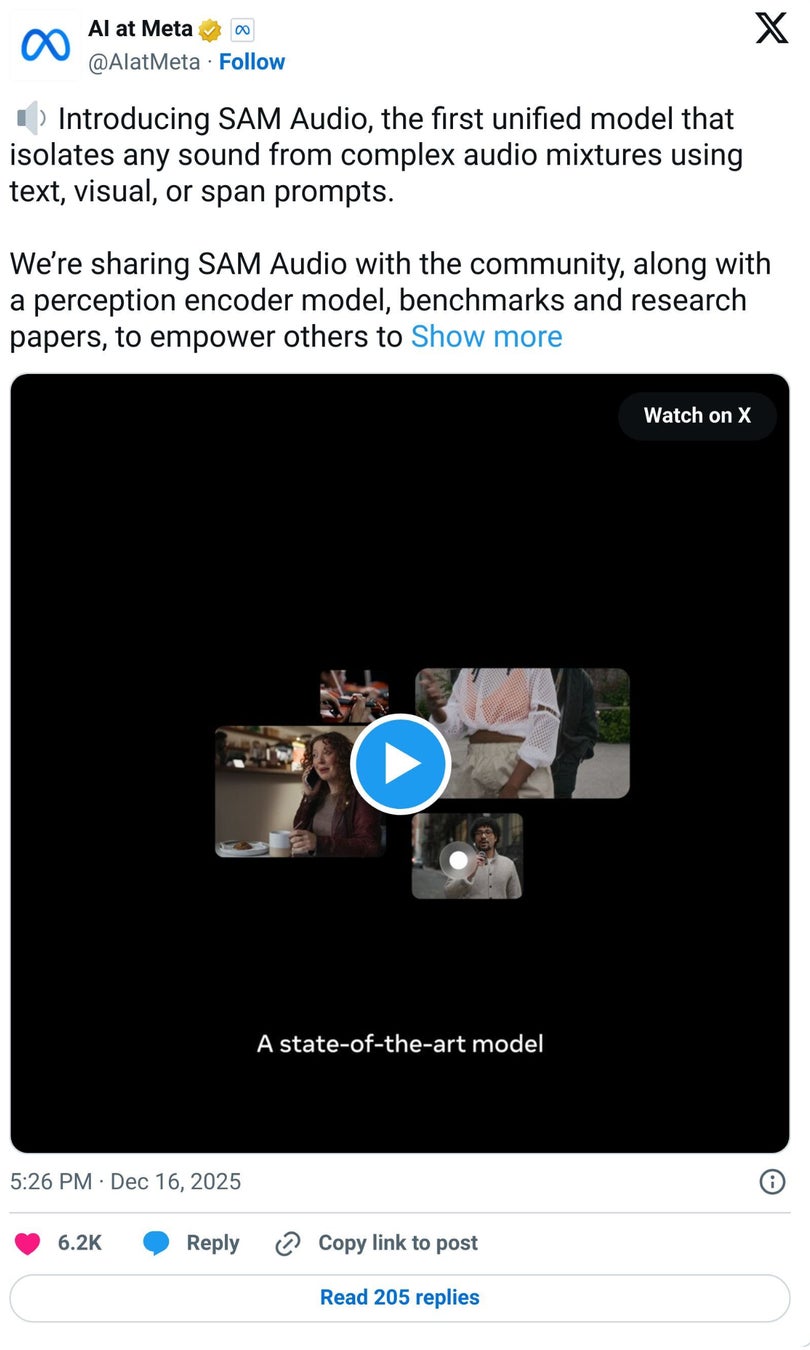 Meta社が、音声や動画から特定の音だけを抽出できるAIモデル「SAM Audio」を公開しました。音楽を楽器ごとに分離したり、雑音を含むインタビュー動画からクリアな話し声だけを取り出したりすることができます。自然言語やクリック操作で直感的に音声を分離できる画期的な機能の紹介とともに、画像・動画・3D・音声といったモダリティを横断して進化する最新のAIモデルのトレンドについて解説します。