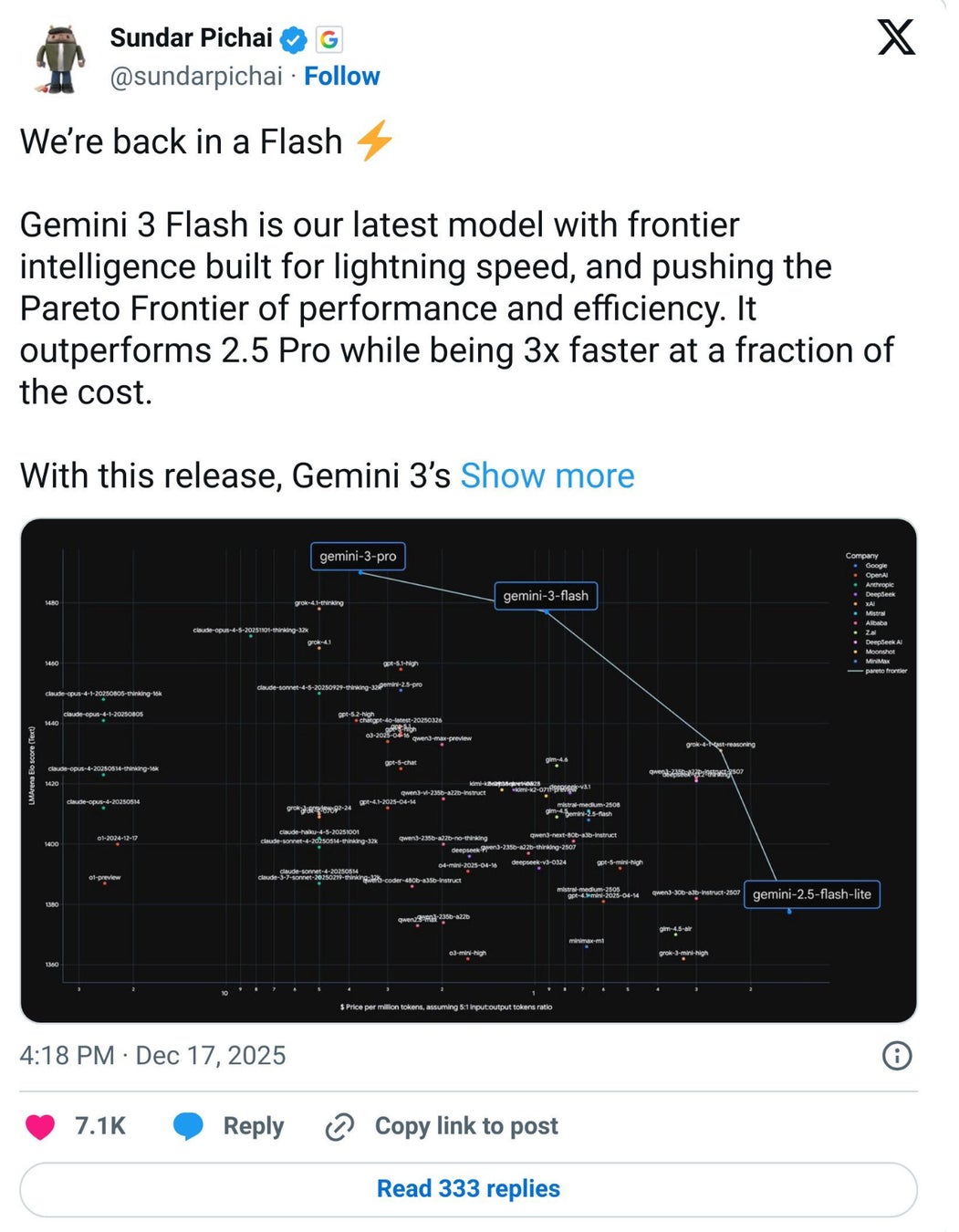 米国時間12月17日、Google社が小型AIモデル「Gemini 3 Flash」をリリースしました。速度とコストパフォーマンスを重視した設計となっており、ベンチマークではGemini 3 Proに匹敵、場合によっては上回るスコアを達成しつつも、速度はGemini 2.5 Proの3倍、実質コストは約10分の1に抑えられています。すでにGeminiアプリやGoogle検索における「AIモード」など、あらゆるGoogleサービスに組み込まれているとのことです。