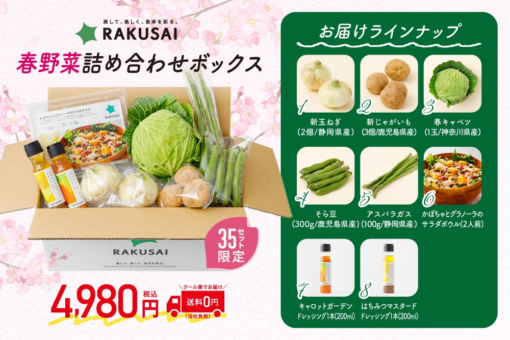 楽彩株式会社(本社:東京都足立区/代表取締役社長:大﨑善保)は、3月3日(月)より“春野菜の詰め合わせボックス”を数量限定にて予約販売いたします。RAKUSAIで人気の「野菜がおいしいミールキット」に加え、旬の新鮮な野菜、そして素材の味を引き立てるオリジナルドレッシングを詰め合わせ、お得なボックスとしてお届けします。春の訪れとともに何かと出費が増えるこの季節。野菜の価格高騰が続く中、RAKUSAIは皆様の食卓を応援するため、今回のキャンペーンをご用意いたしました。旬の味覚をたっぷりの“春野菜の詰め合わせボックス”で、食卓を彩り、心も体も健やかに春をお迎えください。