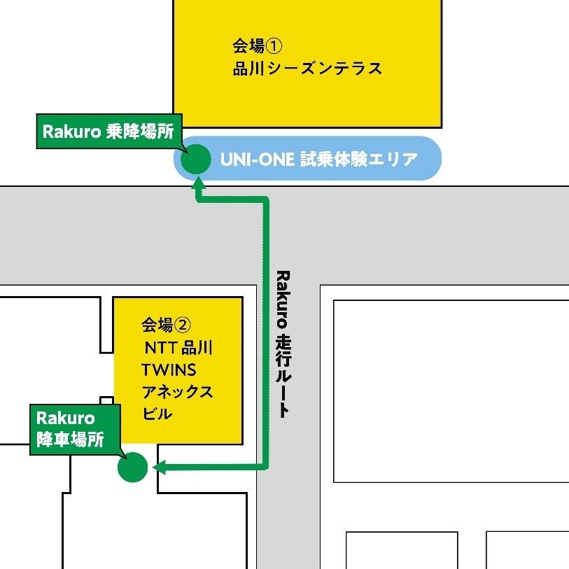 会場➀「品川シーズンテラス」と 会場➁「NTT品川TWINSアネックスビル」の間の移動を、(株)ZMP製の自動運転 歩行速モビリティ「RakuRo(ラクロ)」で行うことができます。