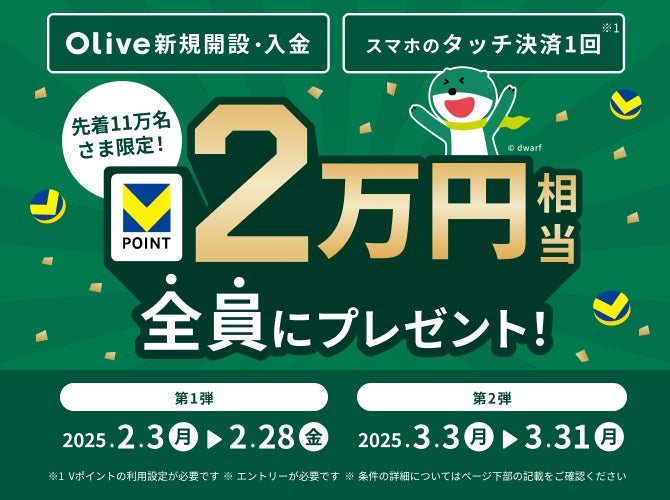【先着11万名さま限定!】Olive新規開設・入金&タッチ決済1回以上・ID連携で20,000円相当プレゼントキャンペーン開始!(第1弾:2/3~2/28、第2弾:3/3~3/31)