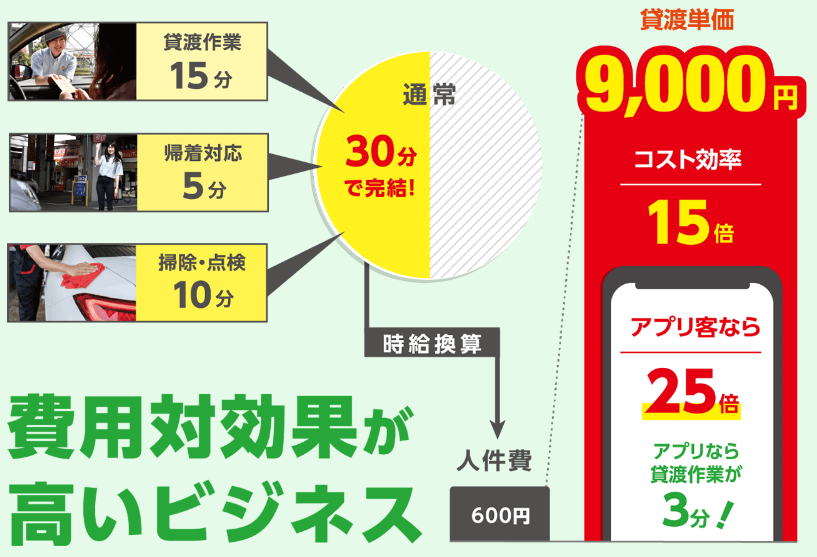 レンタカー作業の所要時間は、貸渡1回あたり30分。スタッフの時給が1,200円とすると、人件費は600円相当です。ニコレンの貸渡単価は約9,000円なので、人件費に対するコスト効率は15倍。アプリ利用の場合、さらに時間が短縮され25倍となります。