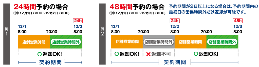予約時に「返却時間」の項目で営業時間外の項目を選択すると、閉店から翌朝の営業開始時刻までの間、好きな時間に返却できます。なお、予約期間が2日以上になる場合は、予約期間内の最終日の営業時間外にだけ返却が可能です。