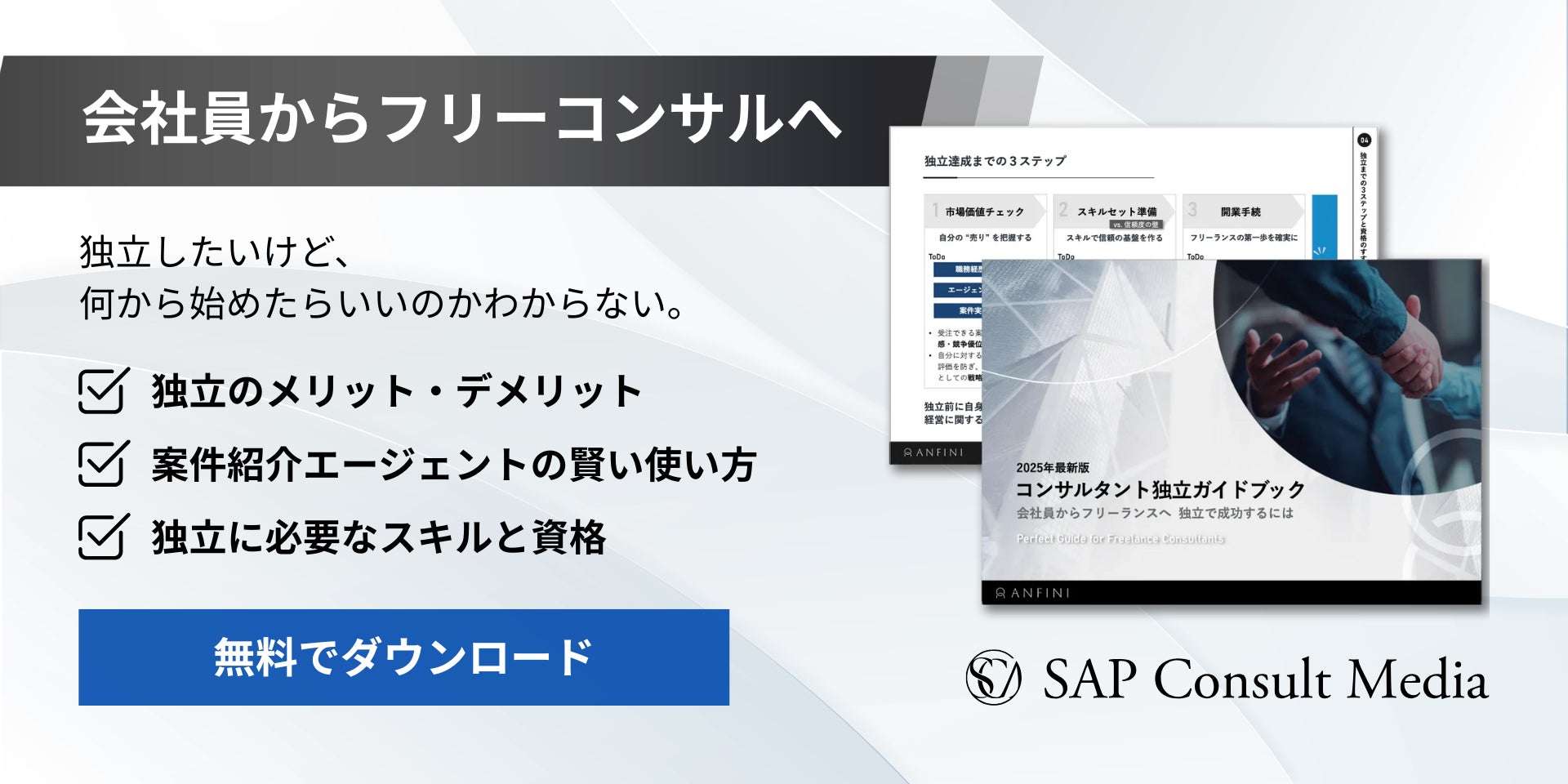 株式会社Anfini(本社:東京都港区、代表取締役:橋本 純)が運営する日本最大級のSAP専門メディア『SAP Consult Media』は、会社員からフリーランスのコンサルタントを目指す方に向けた『【2025年最新版】コンサルタント独立ガイドブック』を公開いたしました。