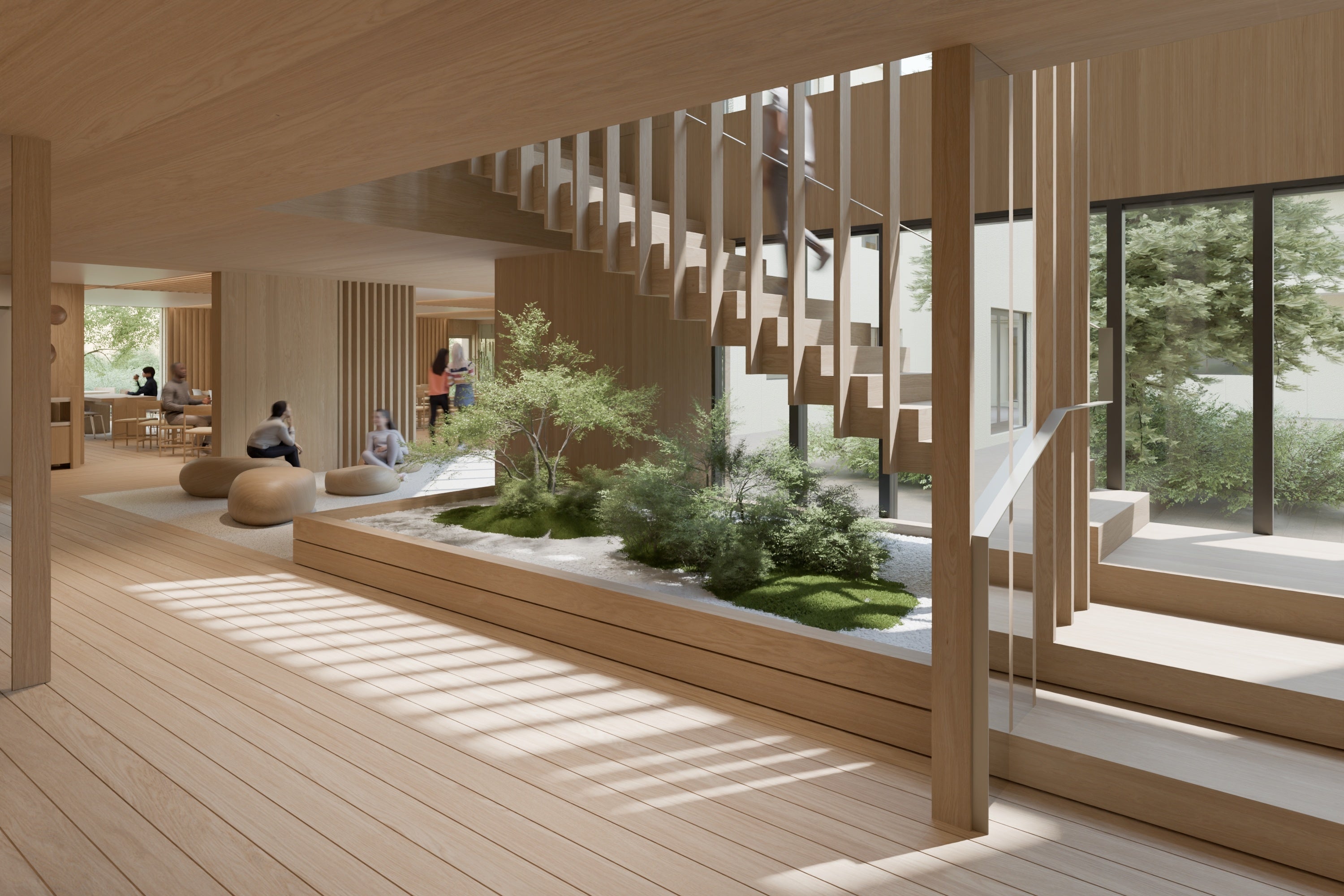 施設内では、2・3階の床構造にNLT(Nail Laminated Timber)(※3)を採用し、フラットで美しい天井空間を実現予定。天井仕上にも木をほどこし、木のぬくもりを視覚的にも体感できる設計としています。また、中庭を中心に食堂やラウンジ、シェアキッチン、多目的スタジオを配置し、自然光と風を取り込む開放的な空間構成としました。さらに、視線が交差する吹き抜け階段を設けることで、学生同士の自然なコミュニケーションを促進。キャンパス内に設置された自主的な学びの場「Learning Commons(※4)」に続く第2のコモンズ「Community-Commons」として、日常生活の中で学びとつながりが生まれる環境を創出します。