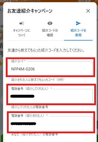 5.問い合わせ後、紹介コードと電話番号を入力してキャンペーンを適用する
