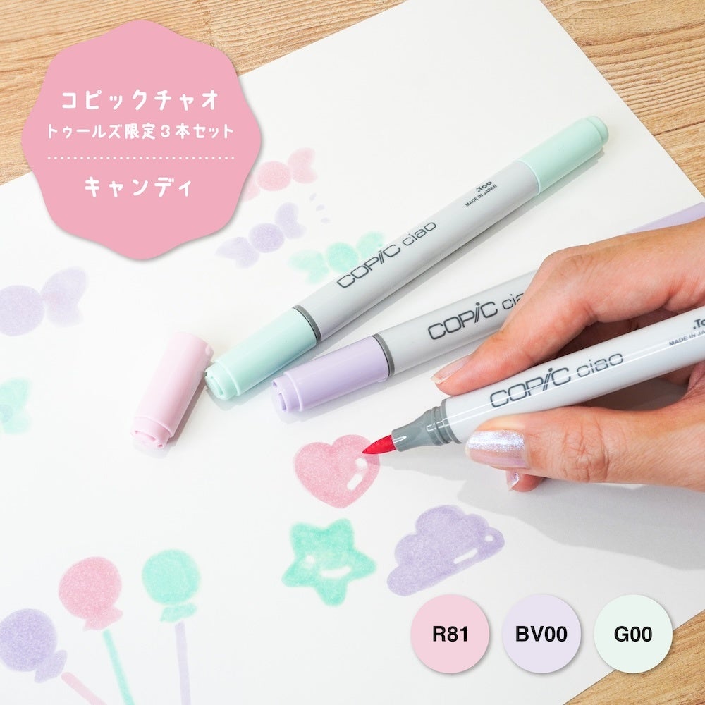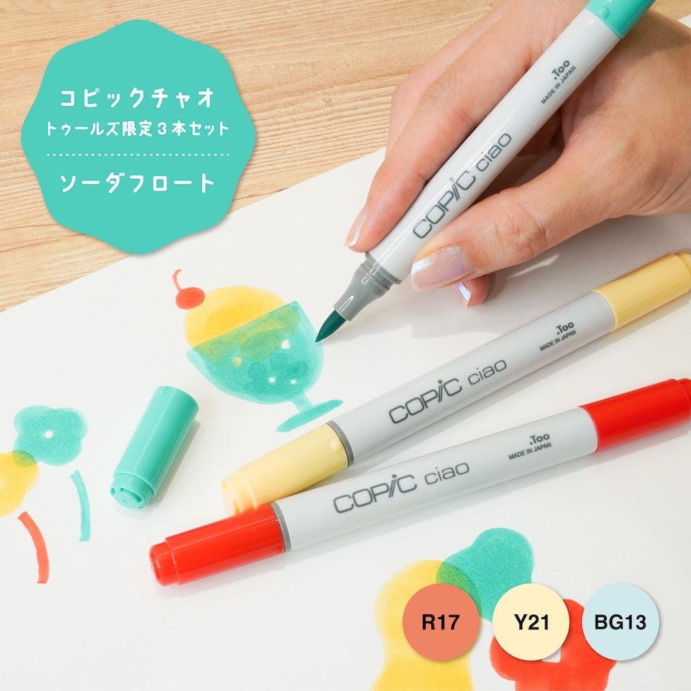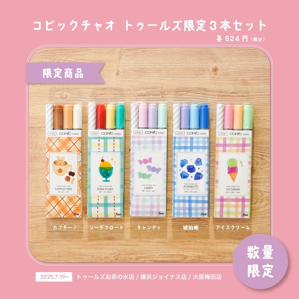 コピックチャオ トゥールズ限定3本セットは、「カプチーノ」「ソーダフロート」「キャンディ」「琥珀糖」「アイスクリーム」の5種類をラインナップ。